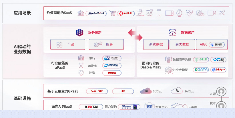 在基礎設施層面,基于商業或開源的云原生就緒開發工具與技術組件(PaaS)和面向AI的底層公共基礎設施資源(IaaS),將共同支撐企業完成數字化轉型